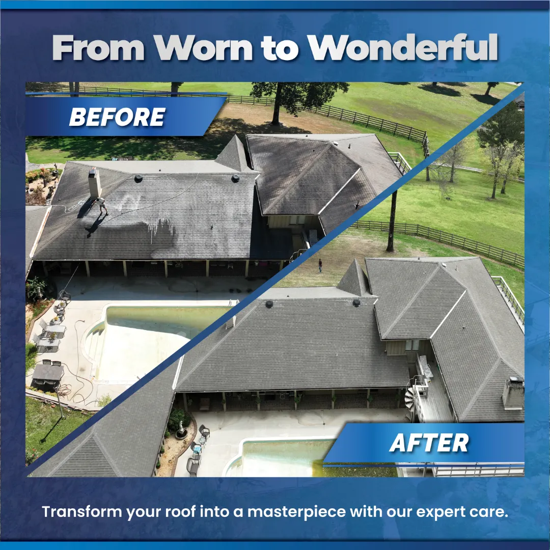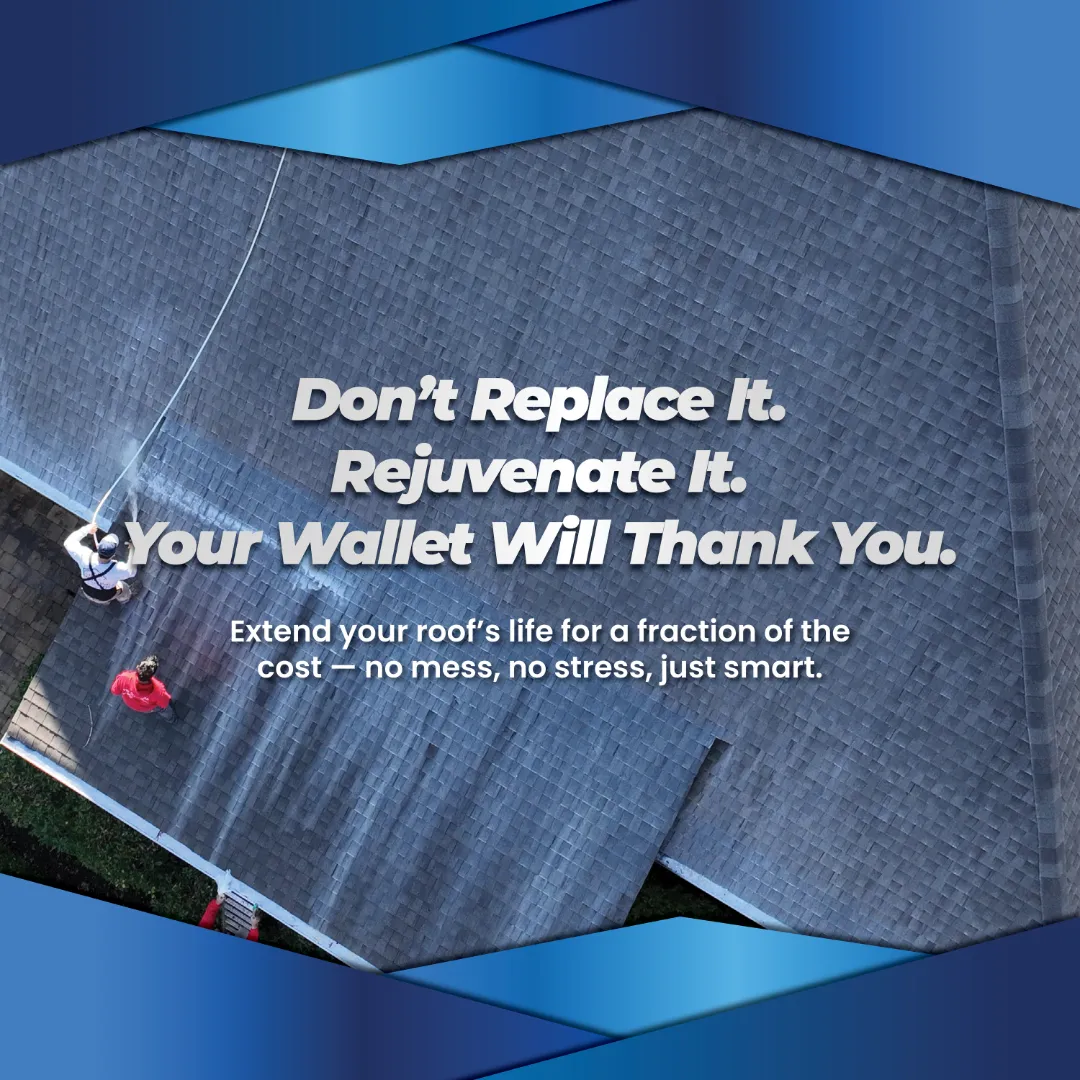 We use a proprietary, biodegradable formula that penetrates your shingles, restores flexibility, stops granule loss, and revitalizes appearance — giving you years of life without replacing your roof.